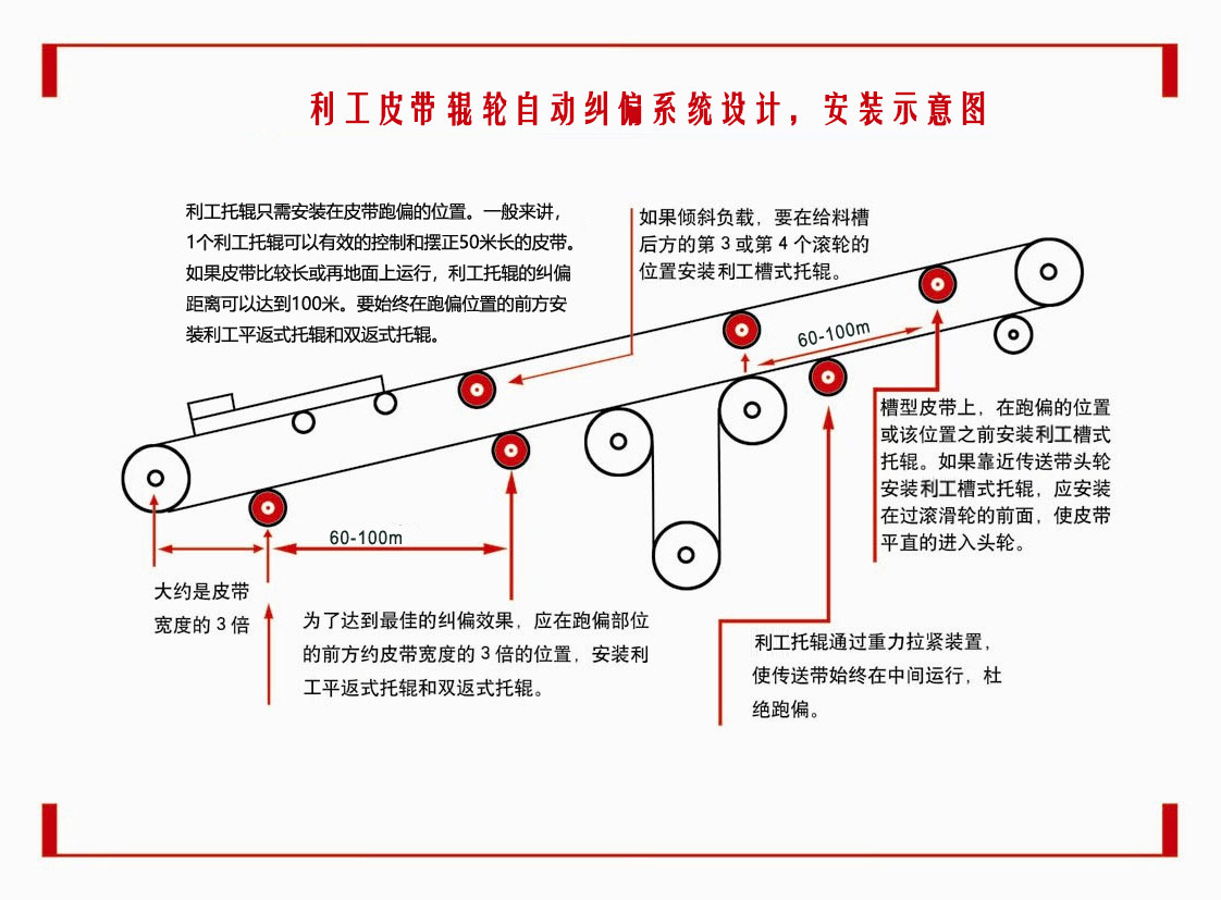 利工皮帶輥輪自動糾偏系統由數組利工調心托輥組件構成 ,即以輸送機傳送帶轉向前 3 倍皮帶寬度處和導料槽出口處,作為關鍵點(起點),每隔 50  ~100 米放置一套相應規格的利工調心托輥組件,來直接取代原有的普通槽式托輥和平行托輥,組成自動糾偏系統。